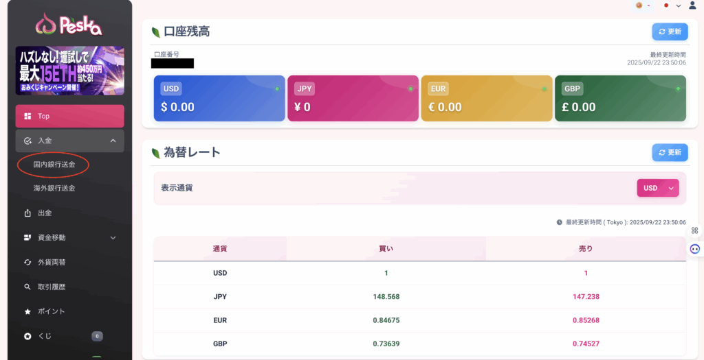上記画面でJPY隣の隠されてる部分はPeska内の残高となります。