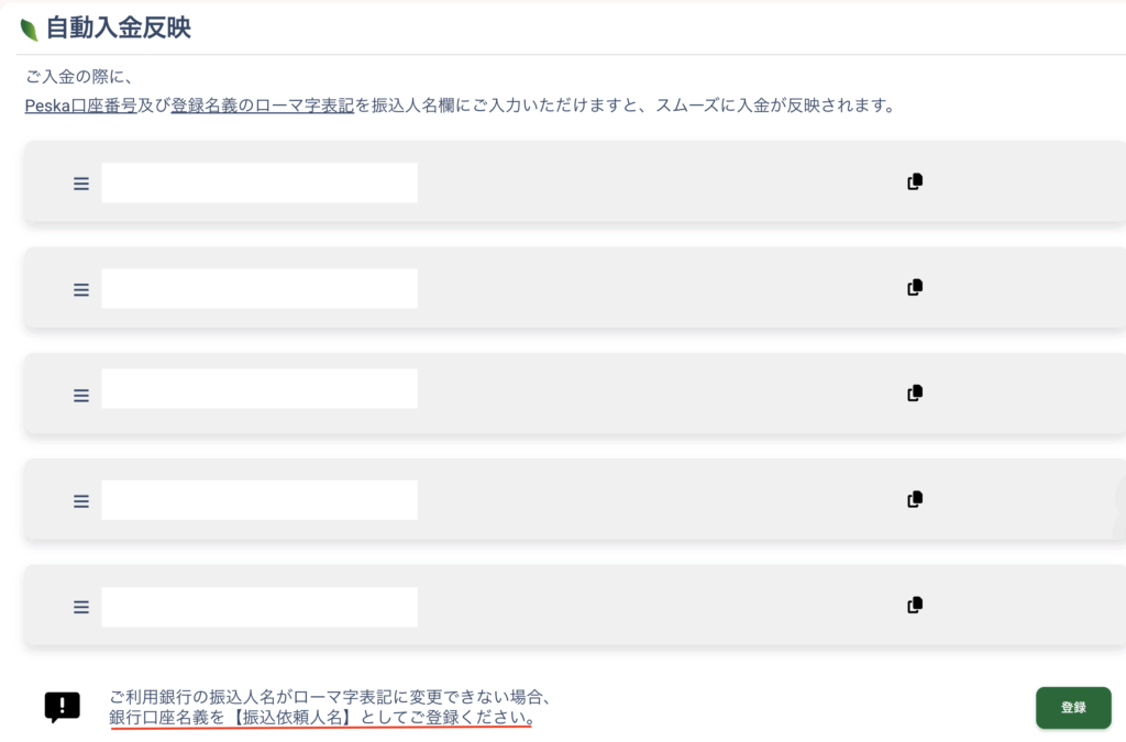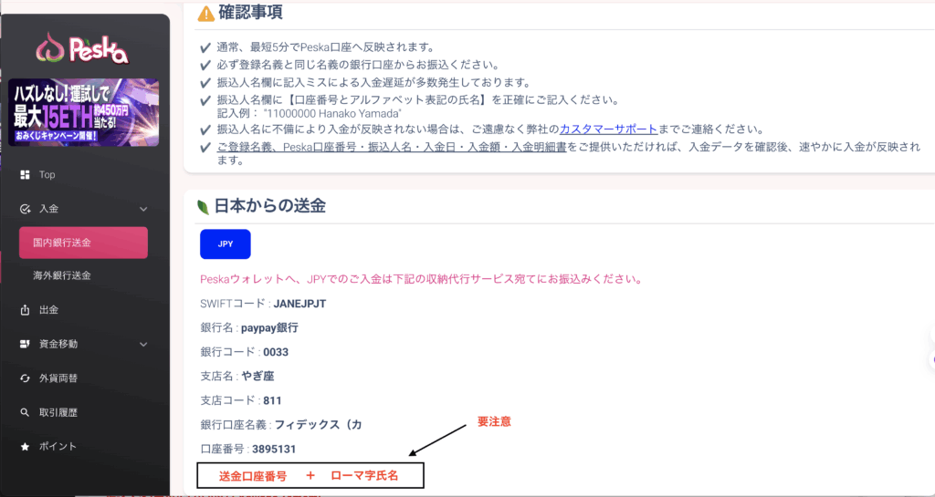 必ず自分が送金を希望するPeska口座番号と名前を入力して振り込みます。